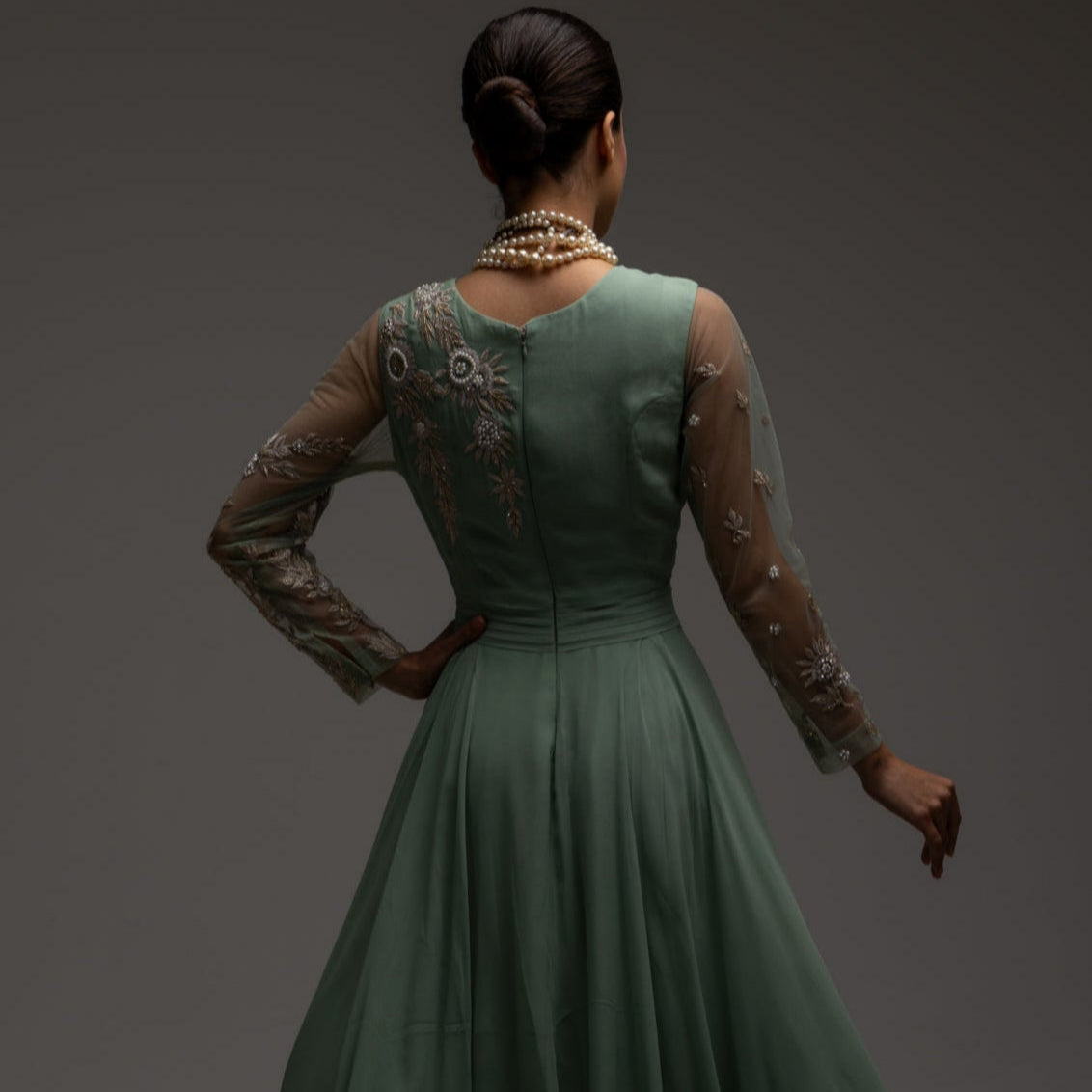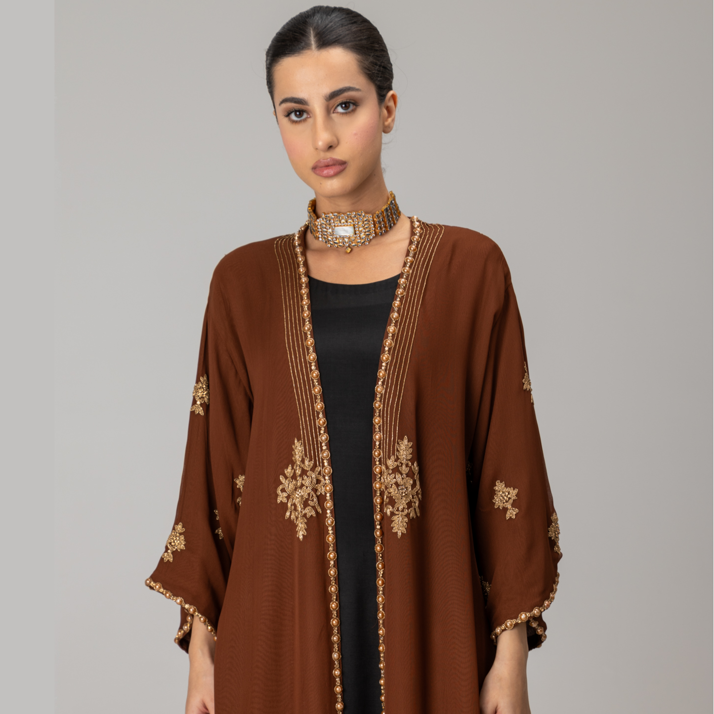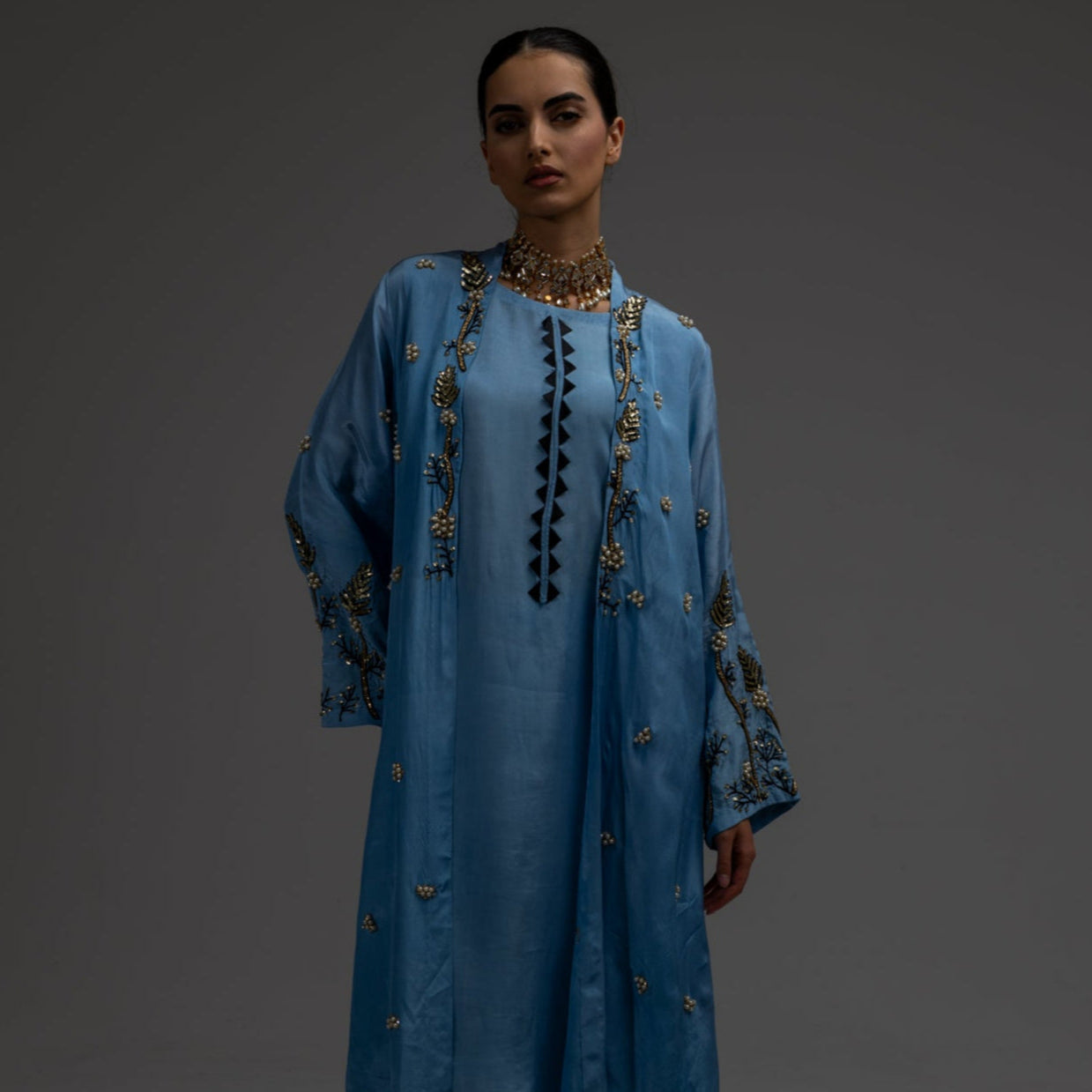 The maxi is adorned with intricate hand embellished embroidery that extends from the neckline, forming an ornate focal panel across the upper bodice. Pearls and kundan are delicately embedded within the embroidery, creating a luminous interplay of texture and light against the rich black base. This craftsmanship is echoed through subtle pearl detailing along the sleeves, adding cohesion and refinement while preserving the garment’s poised simplicity.