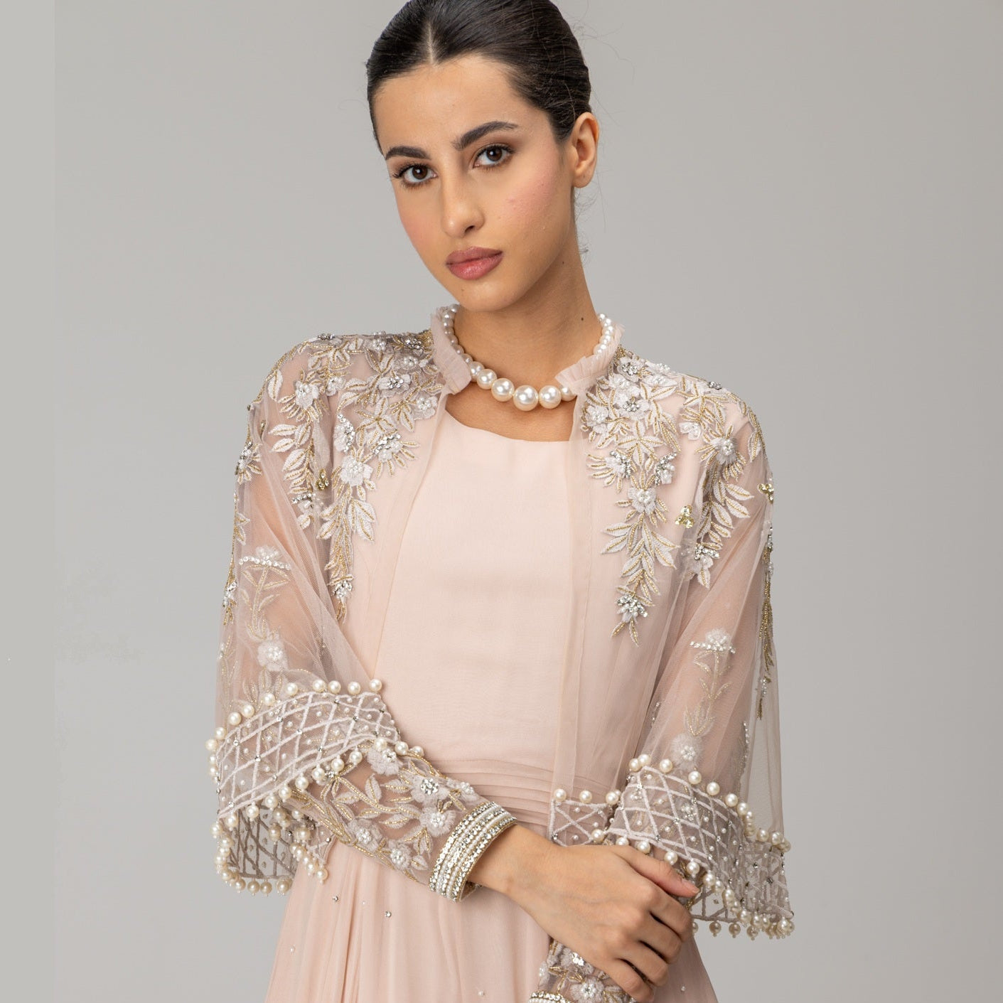 Style with statement earrings and heels to complement the embellishment, creating a look defined by understated opulence and enduring grace.